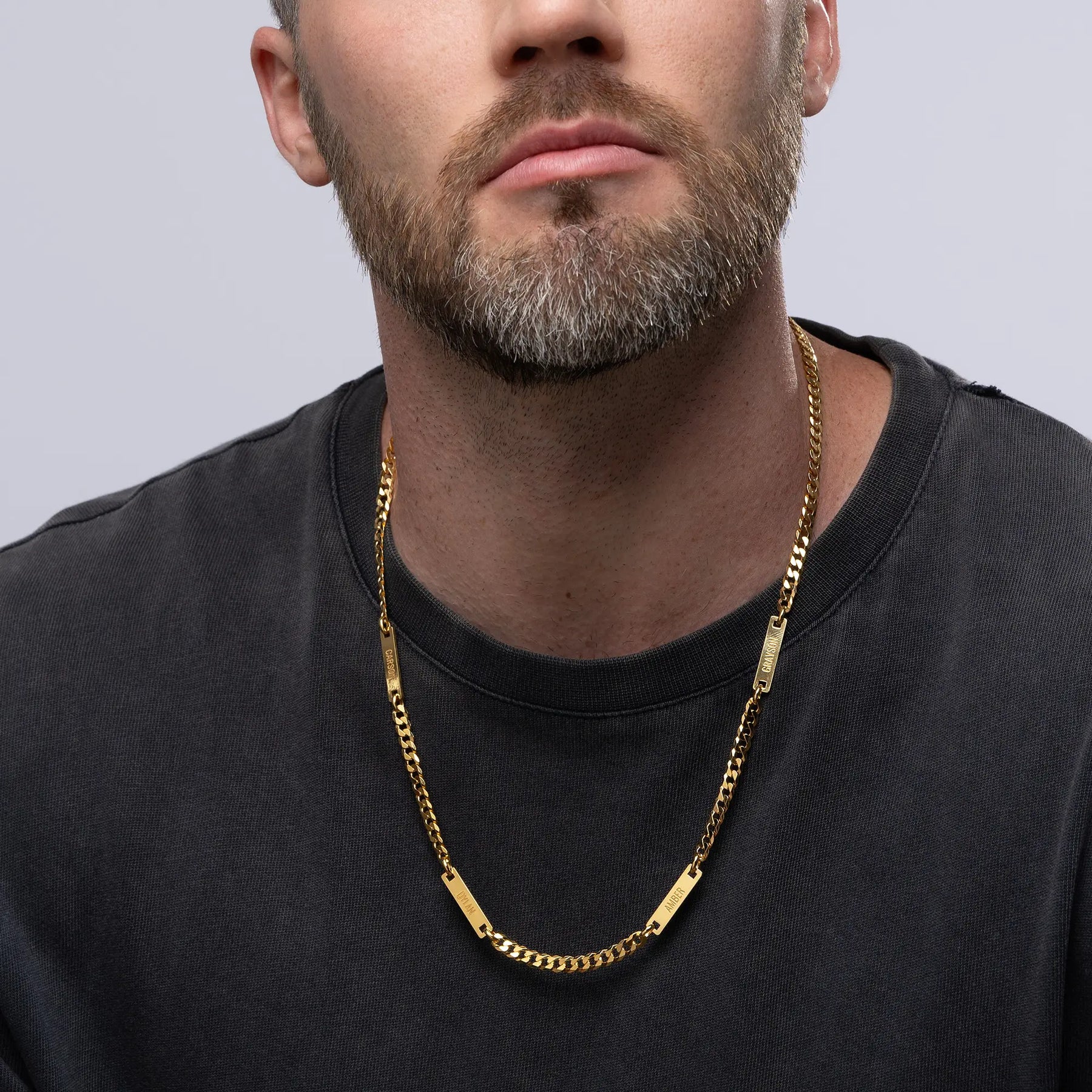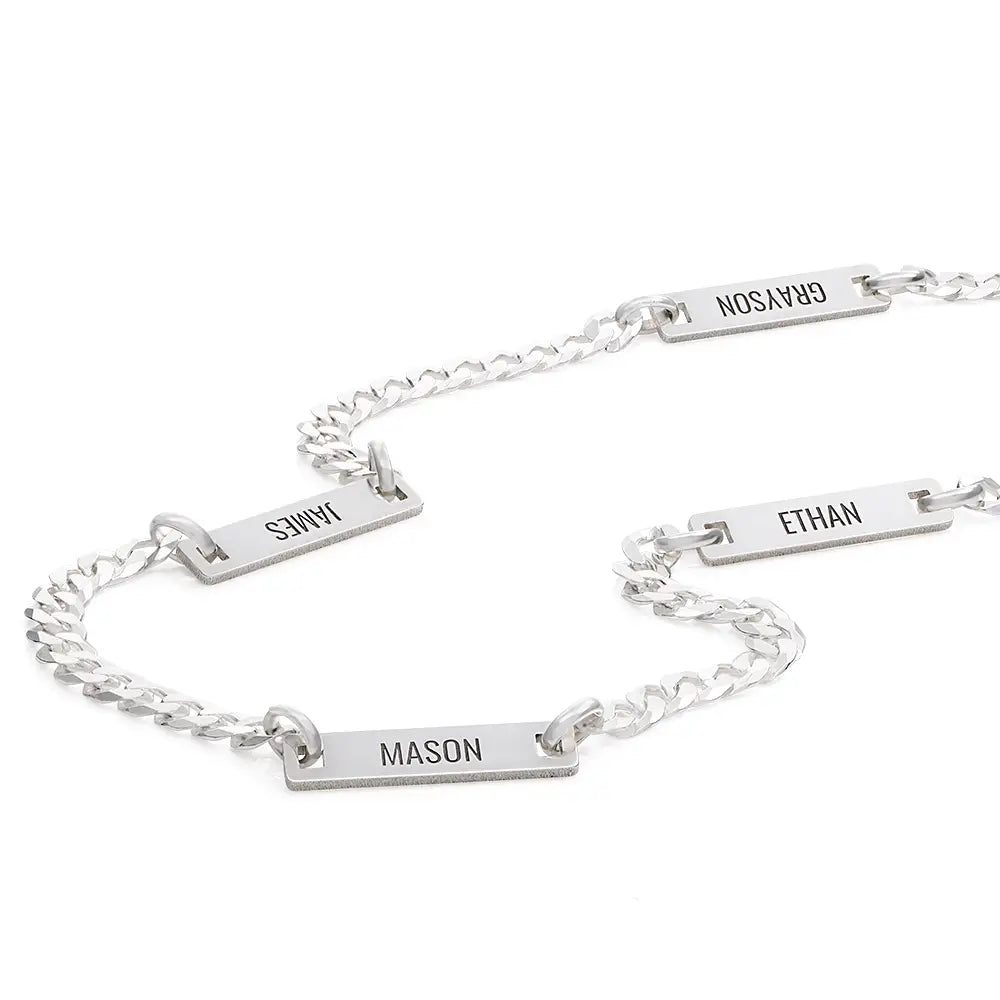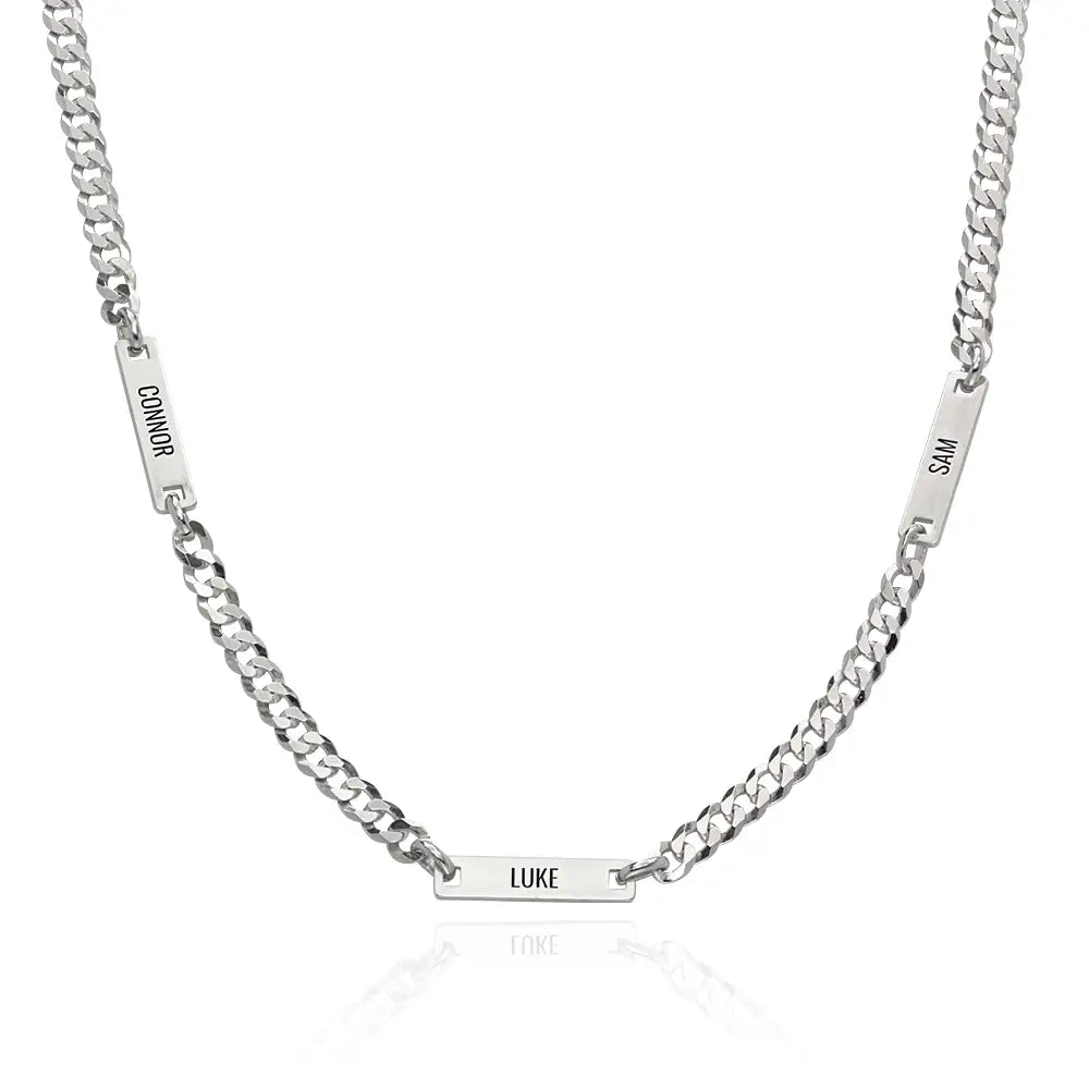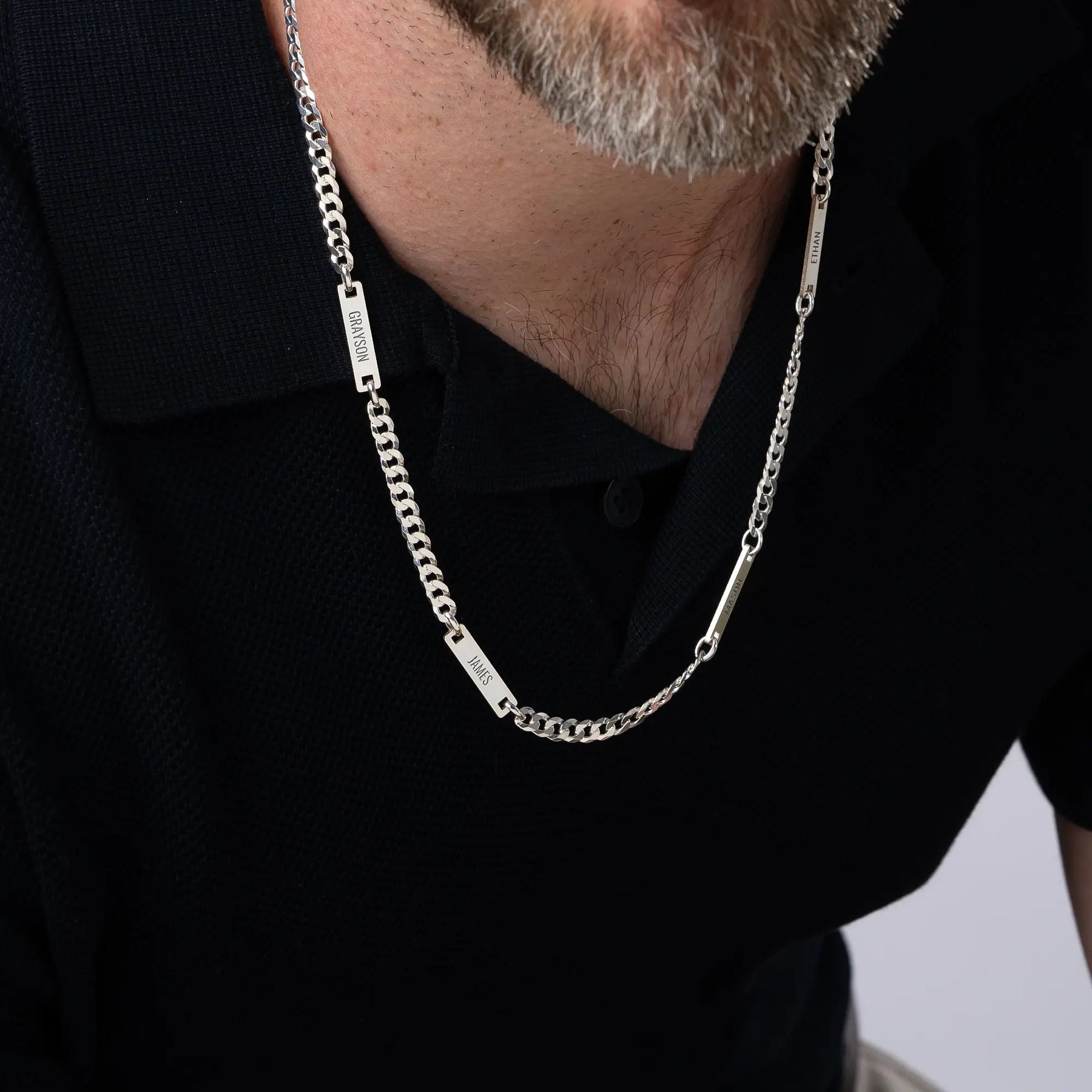 Elegant and masculine, our Men's Necklace with Silver 3D Bar embodies personalization par excellence. This masterpiece consists of a vertical bar pendant that can accommodate up to four inscriptions in an attractive typeface. The pendant hangs on a black leather style chain for a nice visual contrast. This necklace consists of: